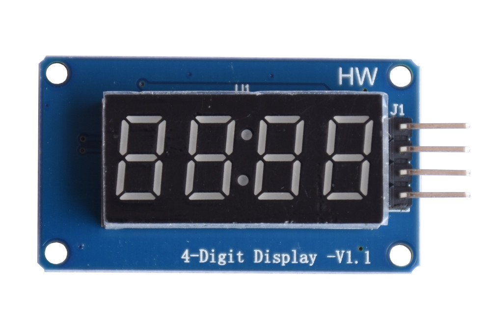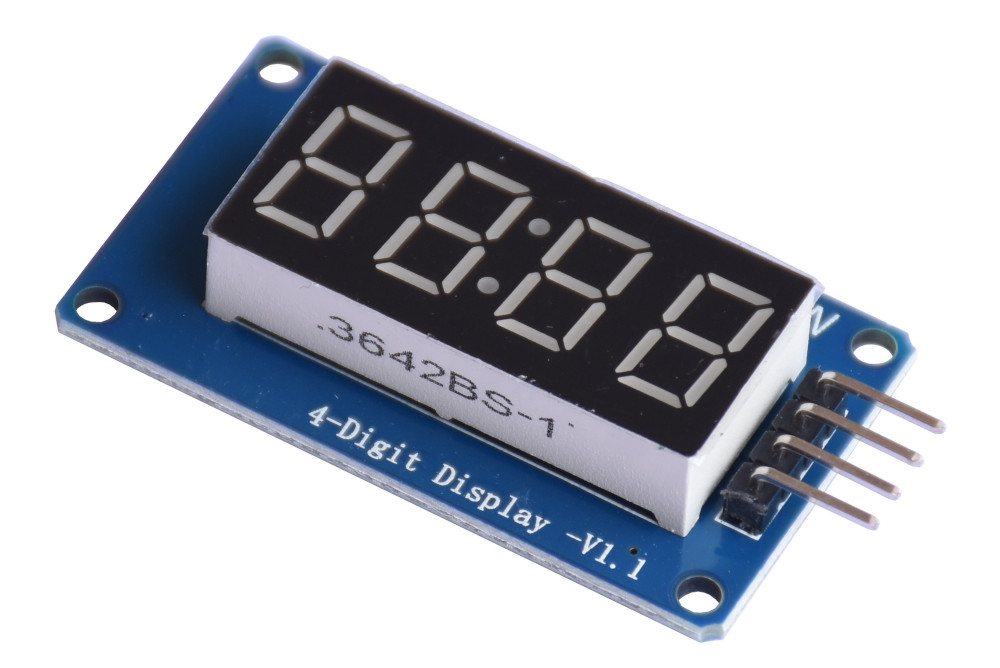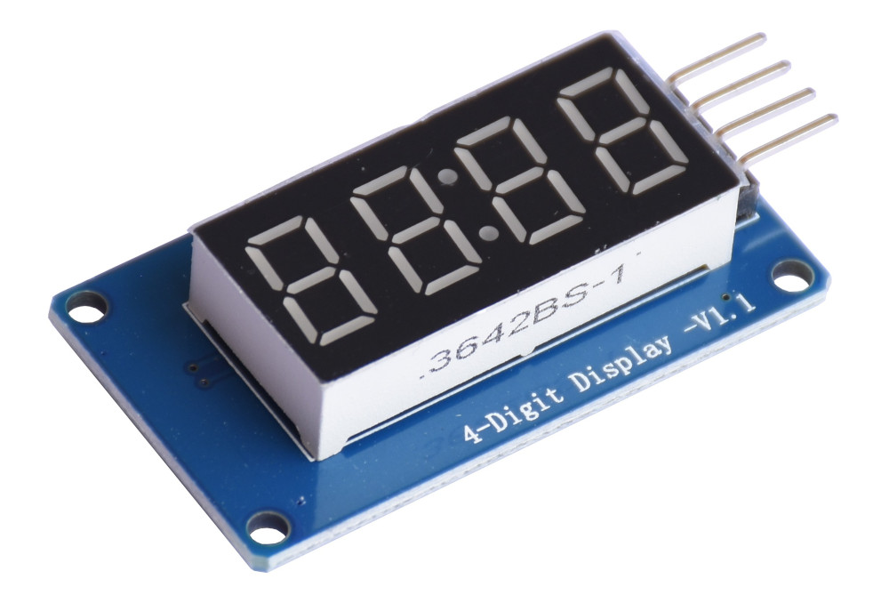 Its a 4 digit seven segment display module which can be used as a clock. It works on 5V. This module is based on TM1637.